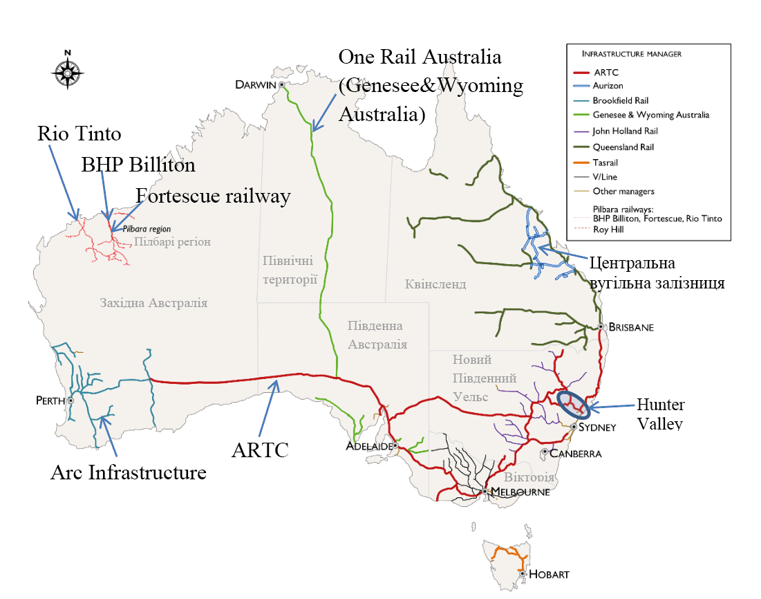 Уже зараз можна констатувати, що в Австралії була реалізована модель з вертикальним розділенням, де національна інфраструктура управляється державним оператором інфраструктури – ARTC, регіональна інфраструктура перебуває у власності штатів або є приватною, наприклад, як оператор інфраструктури – Arc Infrastructure у Західній Австралії. На ринку експлуатації функціонують незалежні приватні компанії-перевізники. До мережі операторів інфраструктури різних форм власності мають відкритий доступ усі приватні перевізники.