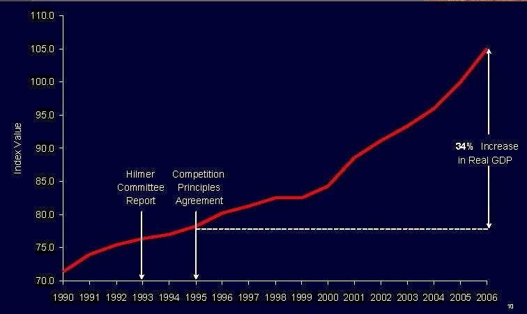На початку 90-х років Австралія, як і Україна, мала велику частку економіки в державній власності. Звісно, саме на цей період припав кризовий процес неефективності державних монополій, та й вплив великих промислових груп доволі значний у цій країні. Особливо з огляду на те, що Австралія — федеративна держава, а у кожного штату є свій уряд і парламент. Однак, після звіту комітету з розслідування конкурентної політики Австралії, очолюваного професором Фредом Гілмером, деканом Австралійської вищої школи менеджменту в Університеті Нового Південного Уельсу, усе почало змінюватися.