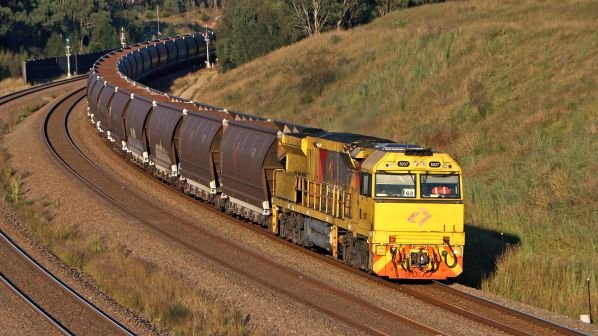 Вантажний поїзд з порожніми вагонами для вугілля компанії Aurizon проходить криву на залізничній лінії Hunter Valley державного оператора інфраструктури ARTC